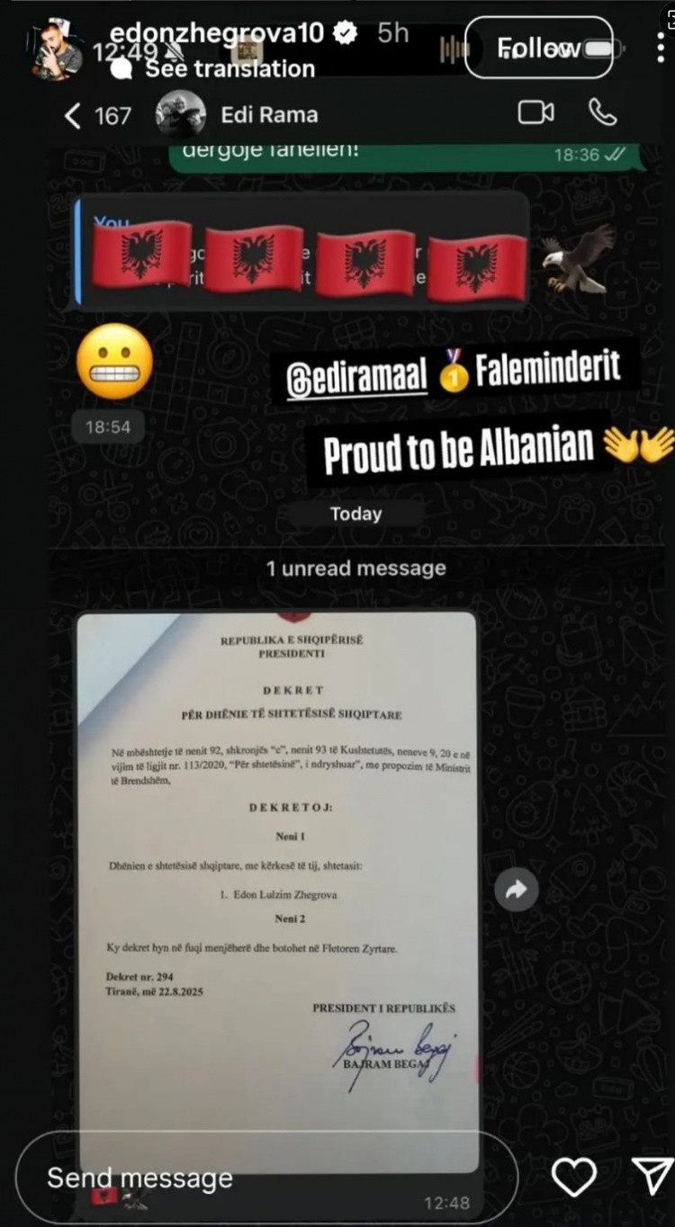 Vào thứ ba, Gergrova đã chia sẻ một cuộc trò chuyện WhatsApp với Tổng thống Albania Eddie Rama trong câu chuyện trên Instagram của mình, cho thấy ông đã có được quốc tịch Albania. Thật thú vị, Rama là một người ủng hộ trung thành của Juventus.