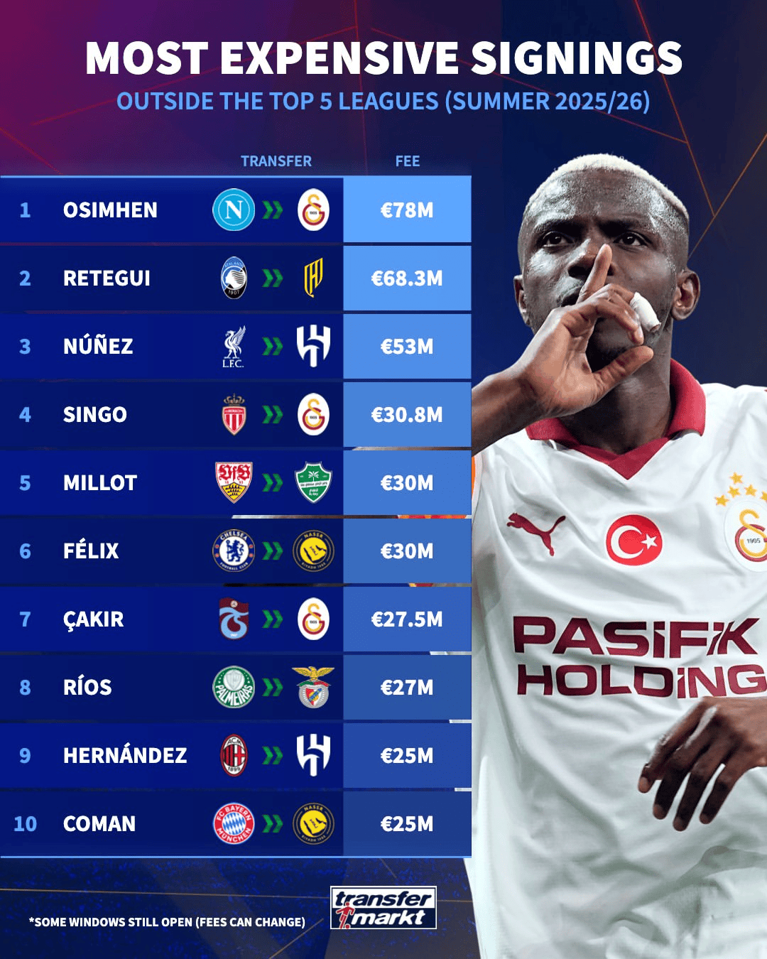 Hupu ngày 4 tháng 9 khi cửa sổ chuyển nhượng mùa hè của mùa giải 2025/26 đã đóng cửa, TransferMarkt tuyên bố xếp hạng các bản hợp đồng đắt nhất bên ngoài năm giải đấu lớn. Trong số đó, Osmeen gia nhập Galatasaray khổng lồ Thổ Nhĩ Kỳ với phí chuyển nhượng lên tới 78 triệu euro, trở thành bản hợp đồng đắt nhất bên ngoài năm giải đấu lớn.