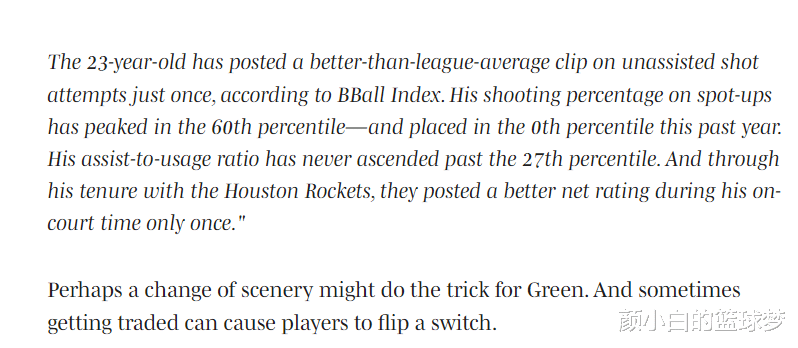 Mùa trước, màu xanh lá cây trung bình 21 điểm, 4,6 rebound, 3,4 hỗ trợ và 0,9 đánh cắp, với tỷ lệ bắn là 42,3%. Mức lương của anh ấy là 33,33 triệu trong mùa giải mới xếp thứ 49 trong giải đấu. Green đã bị các Chiến binh nhắm đến nghiêm túc trong vòng playoffs, và suy thoái của anh ta trở thành chìa khóa cho lối ra của Rockets khỏi sự phá vỡ.